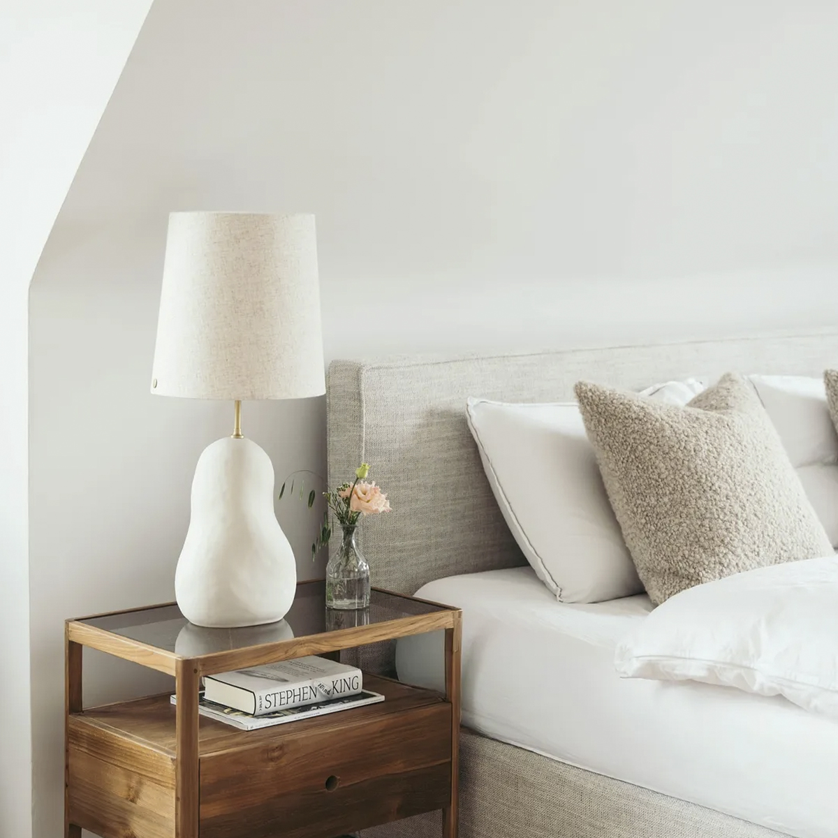 The Hebe lamp series updates the classic lamp with bold shapes and an artistic touch. Initially sculpted by hand, the fluid silhouette of the base is inspired by nature and has a feminine note. Made of ceramic, this medium-sized base has a matte, coarse, and light finish, offering any room a rough, yet calm look.