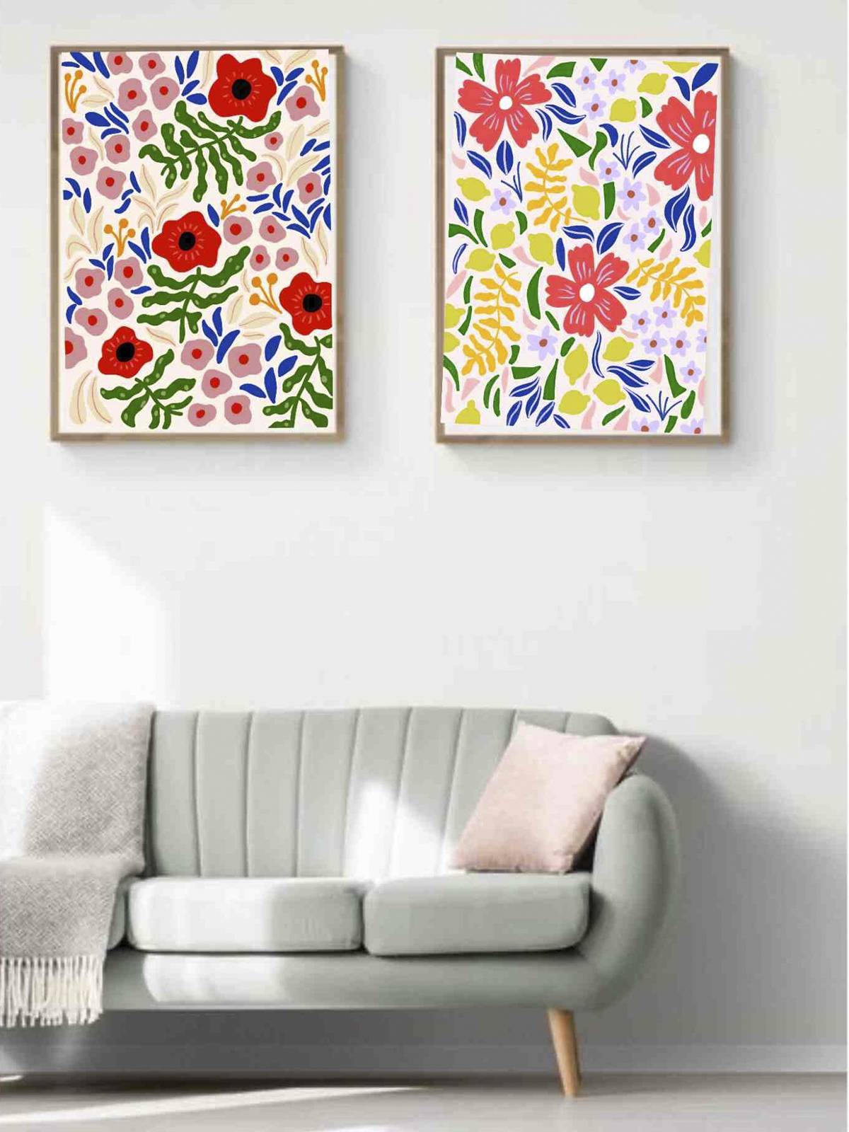 Compositions that are based on the joining, interaction, and overlapping of shapes until they are diluted in the drawing. Strong and contrasting colors also contribute to the dissolution of the contours of the image, through abstraction.
