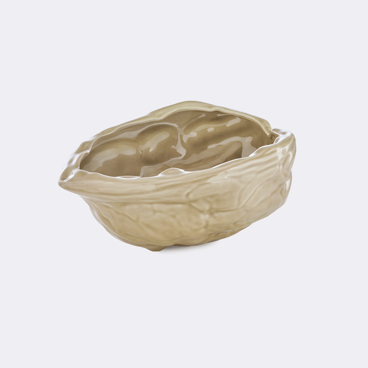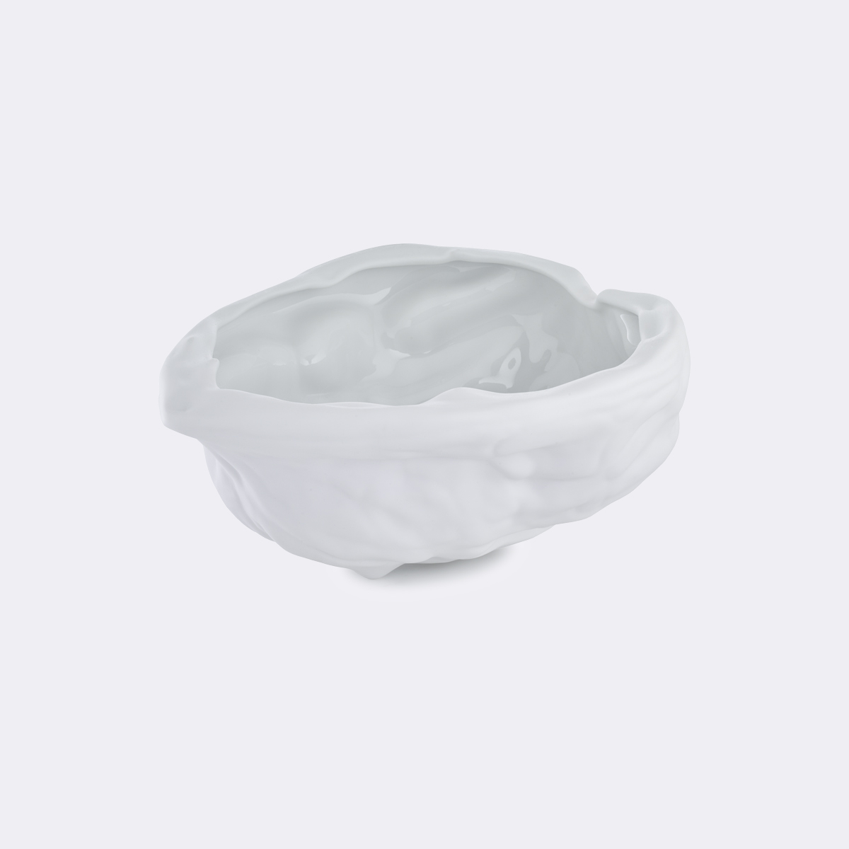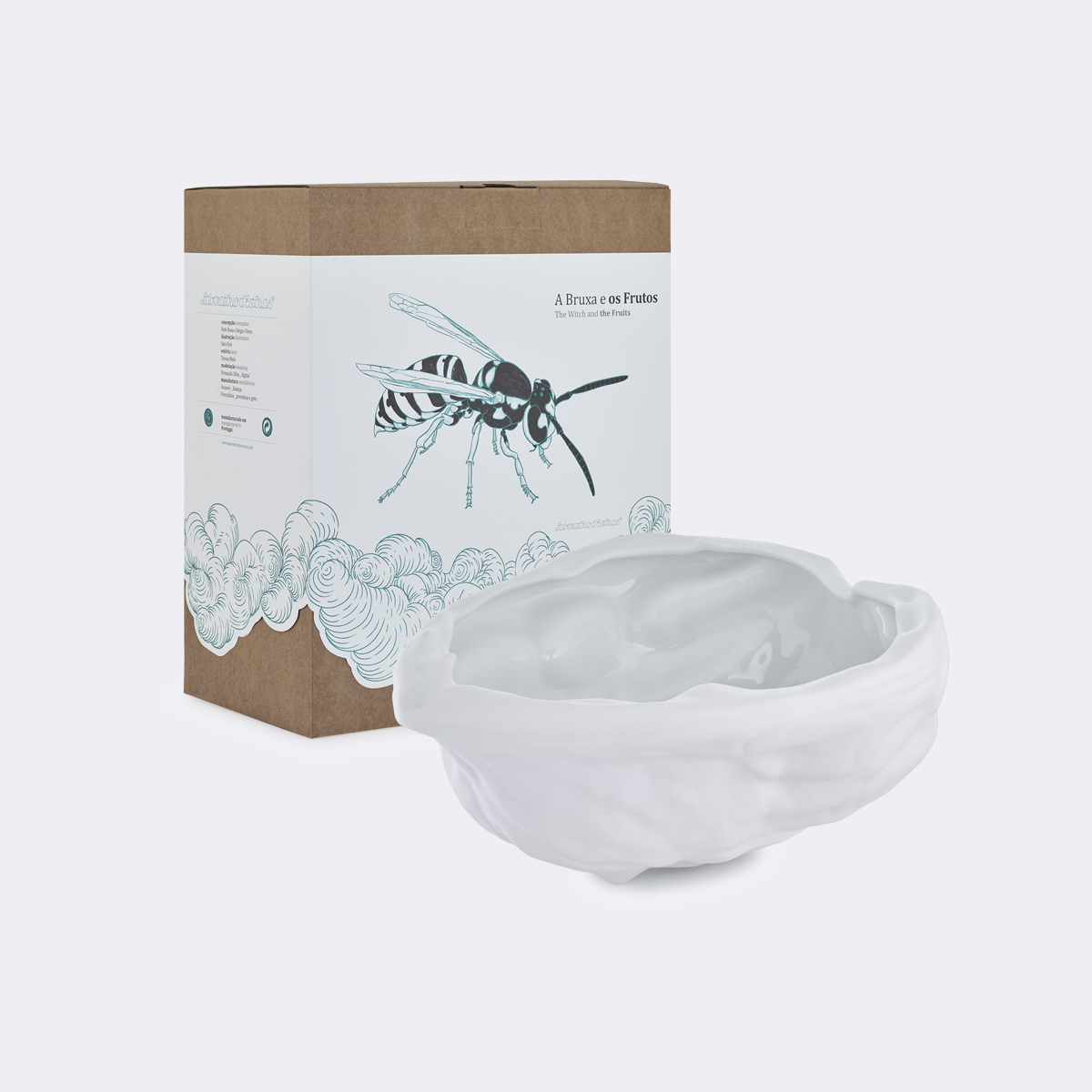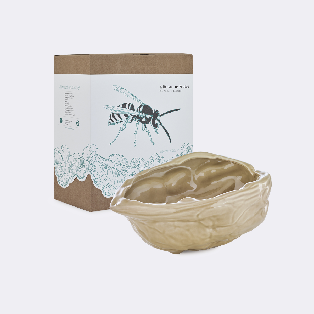 The walnut porcelain bowl is a representation of a walnut, where digital and manual modeling is strengthened and valued mutually. This piece is made in two folders: porcelain, glazed inside to transparent, according to the use of the tradition of manual technique of diving. The cardboard box is surrounded by a paper strap that contains the illustration and the synopsis of the short story "The Witch and the Fruits".