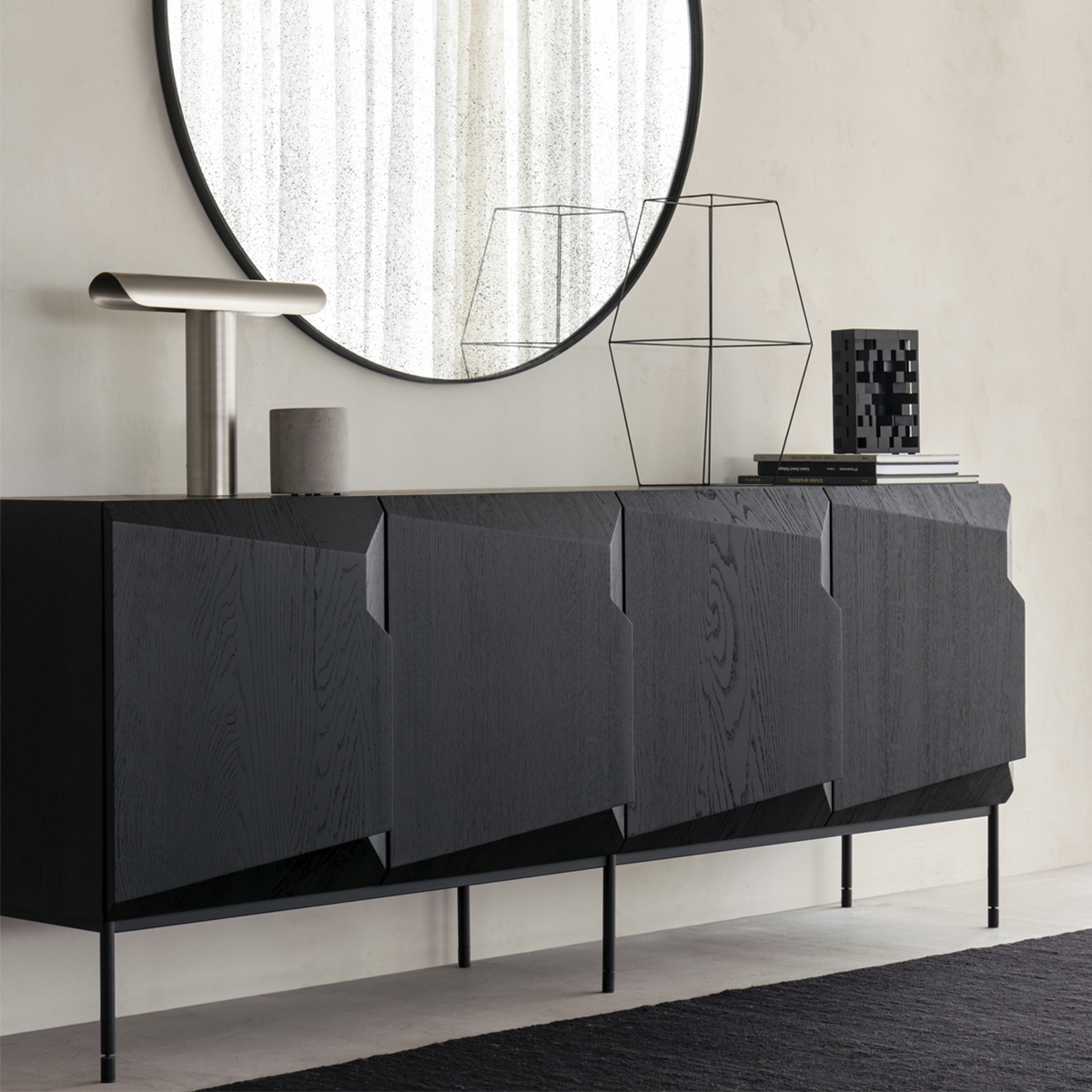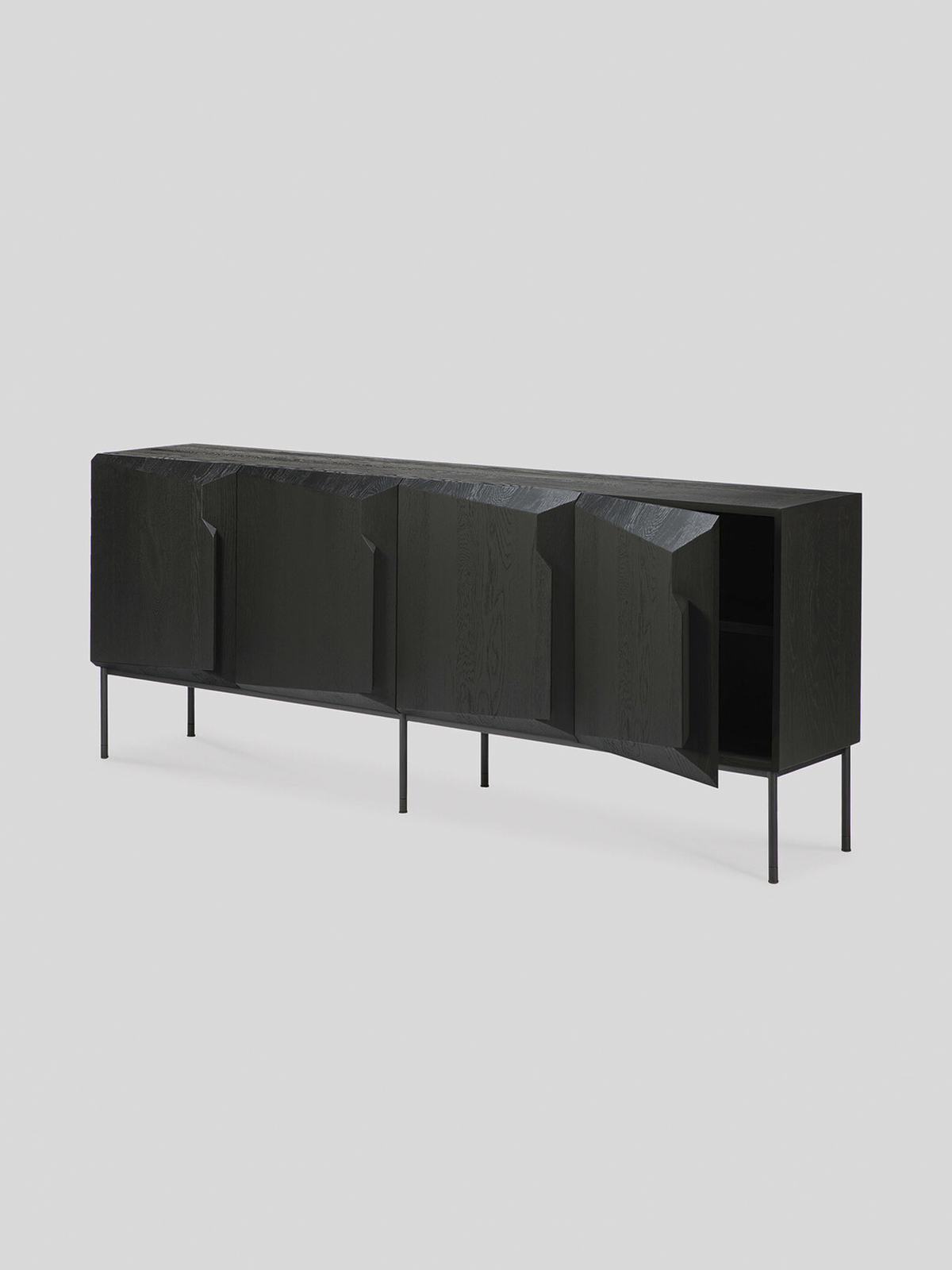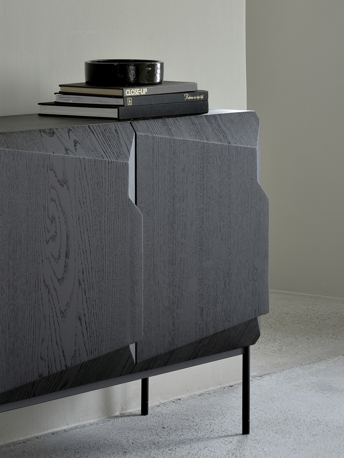 Uma composição angular, desenhada por Alain van Havre, forma o coração de um design que visa distanciar-se das tradicionais superfícies estáticas e imóveis. É criada uma sensação única de volume que altera a percepção do aparador à medida que passa.