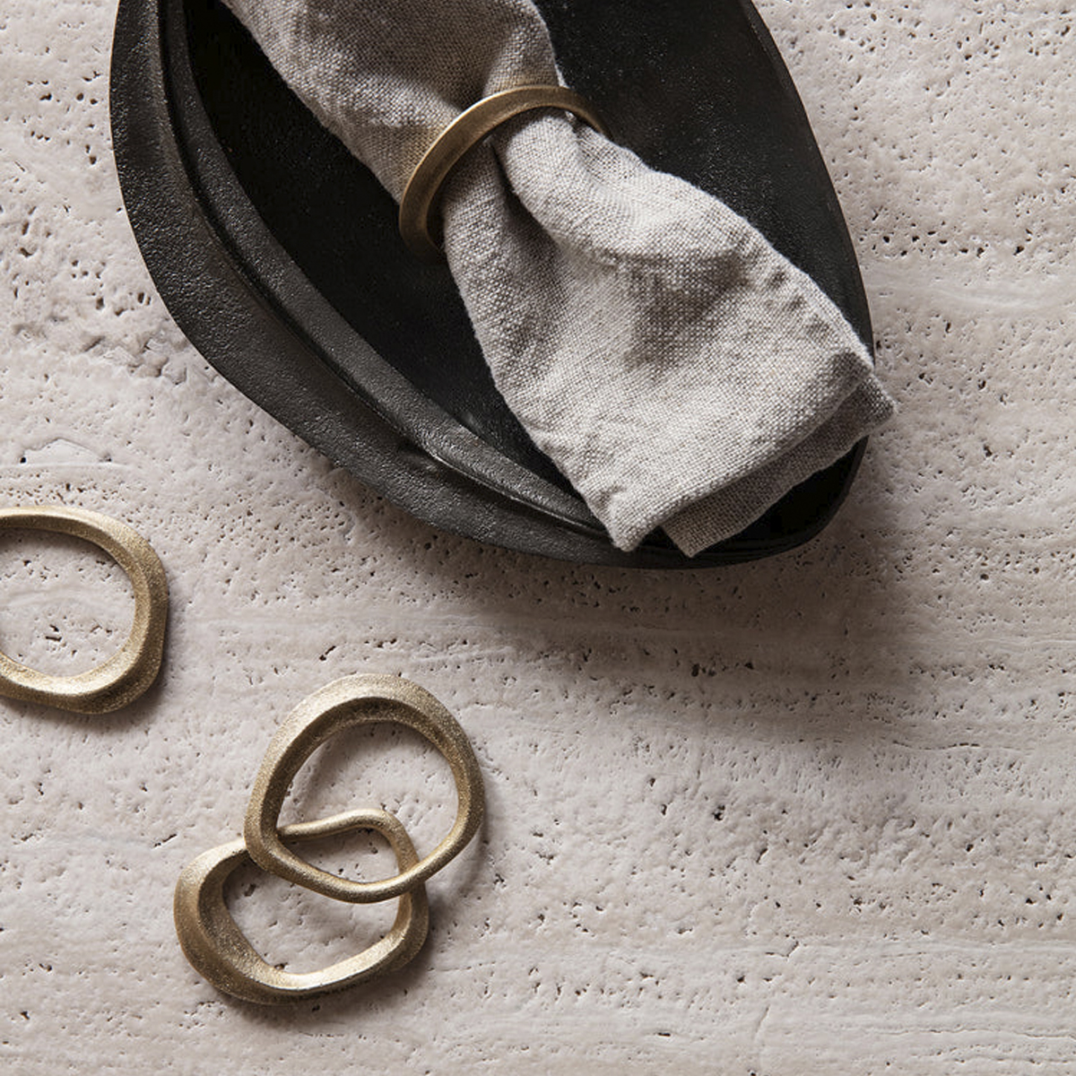 Moldado em formas fluidas e orgânicas, este conjunto de quatro argolas para guardanapo ajuda-o a arrumar a sua mesa. Cada conjunto apresenta quatro anéis em latão maciço de formato individual.