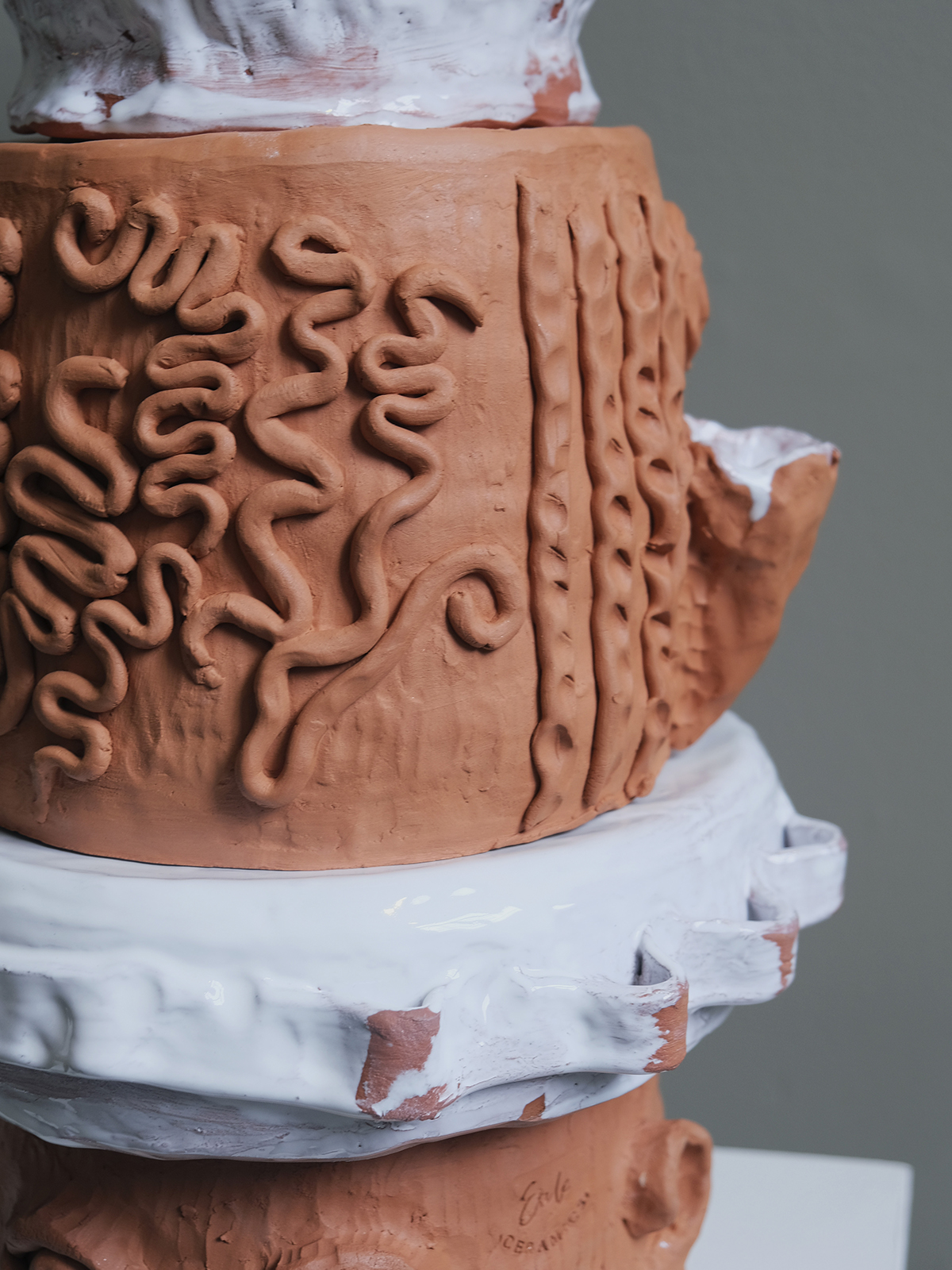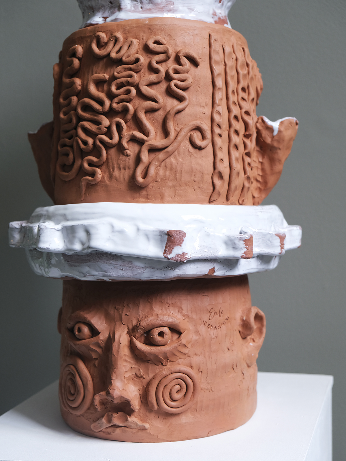 Em “Gestos e Volumes”, Eva apresenta o trabalho em cerâmica pela experimentação direta com o barro. Cada peça resulta de um processo instintivo, sem desenho prévio, onde o gesto das mãos define a forma e a textura. O resultado são volumes singulares, de pequena e média escala, que revelam a exploração da matéria em estado puro. “Gestos e Volumes” reúne um conjunto de peças escultóricas que evidenciam a abordagem contemporânea da artista à cerâmica, centrada na autenticidade e na singularidade de cada objeto.