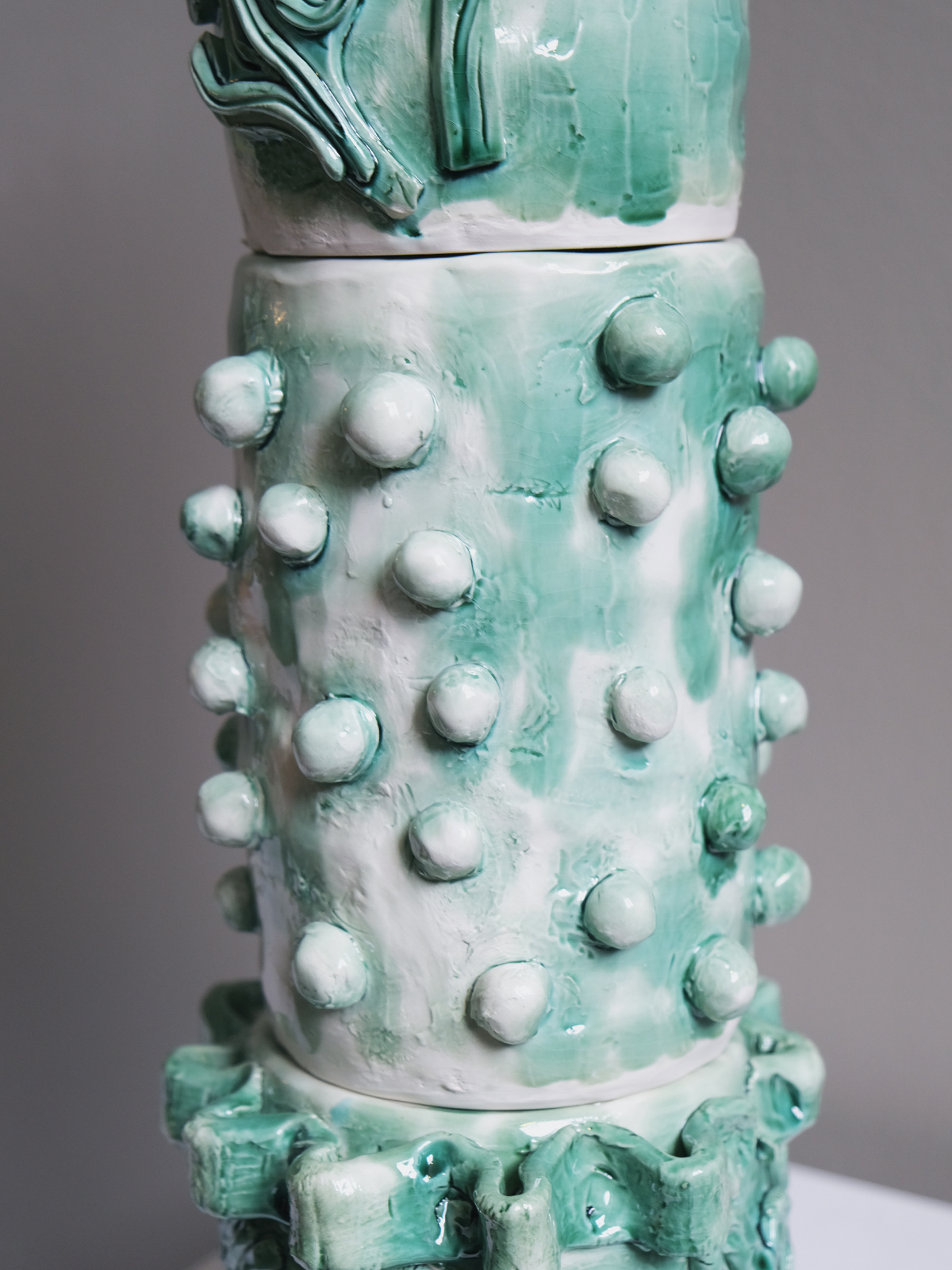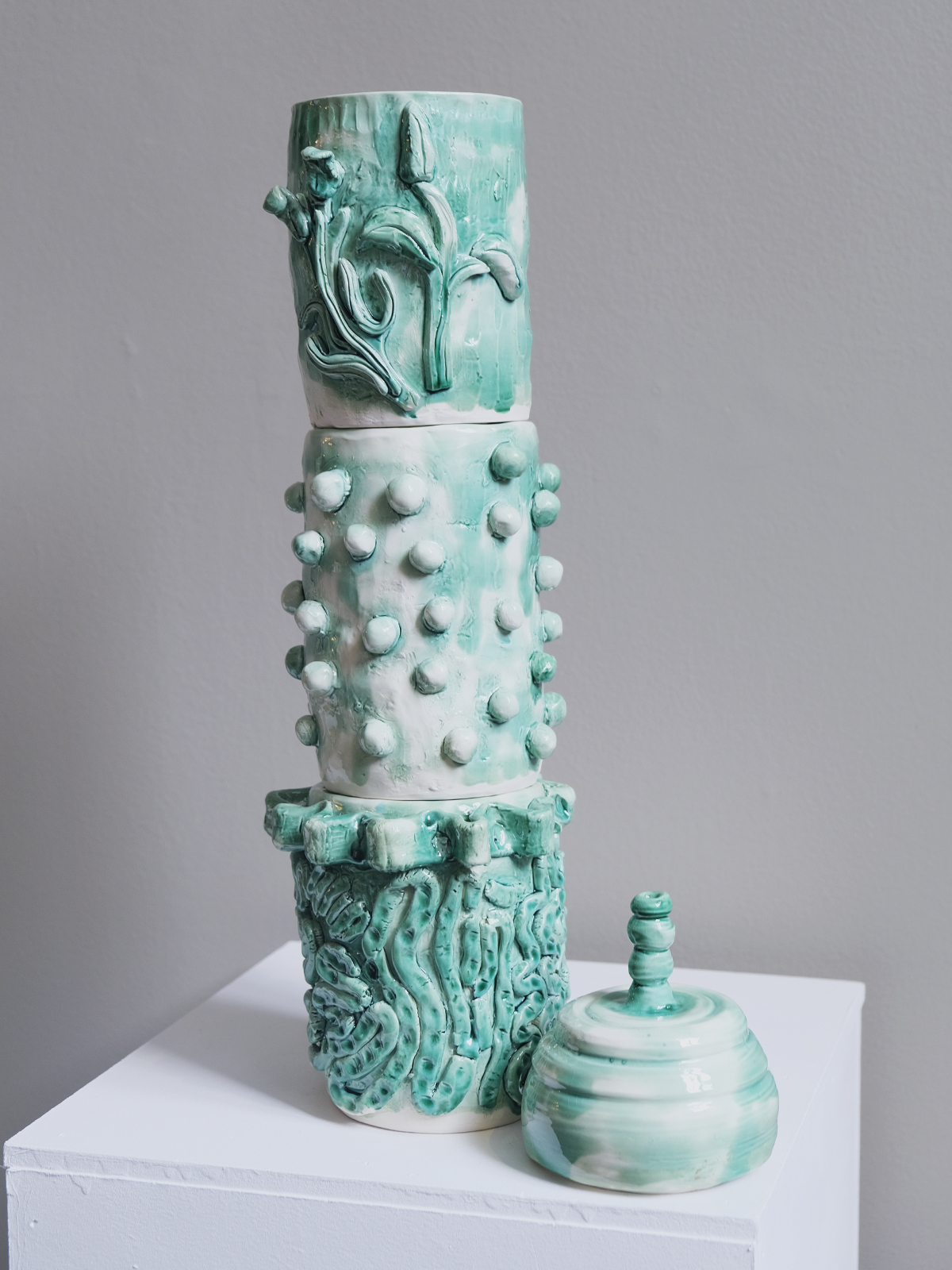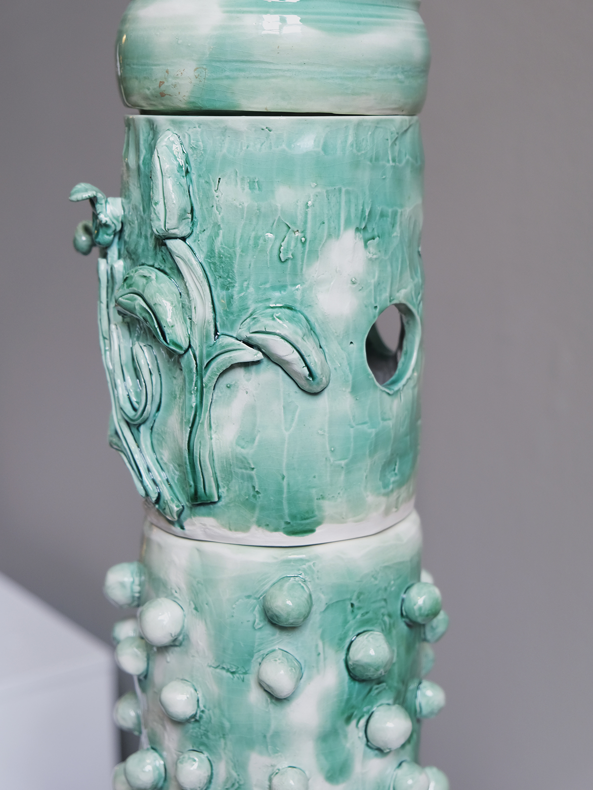 Em “Gestos e Volumes”, Eva apresenta o trabalho em cerâmica pela experimentação direta com o barro. Cada peça resulta de um processo instintivo, sem desenho prévio, onde o gesto das mãos define a forma e a textura. O resultado são volumes singulares, de pequena e média escala, que revelam a exploração da matéria em estado puro. “Gestos e Volumes” reúne um conjunto de peças escultóricas que evidenciam a abordagem contemporânea da artista à cerâmica, centrada na autenticidade e na singularidade de cada objeto.