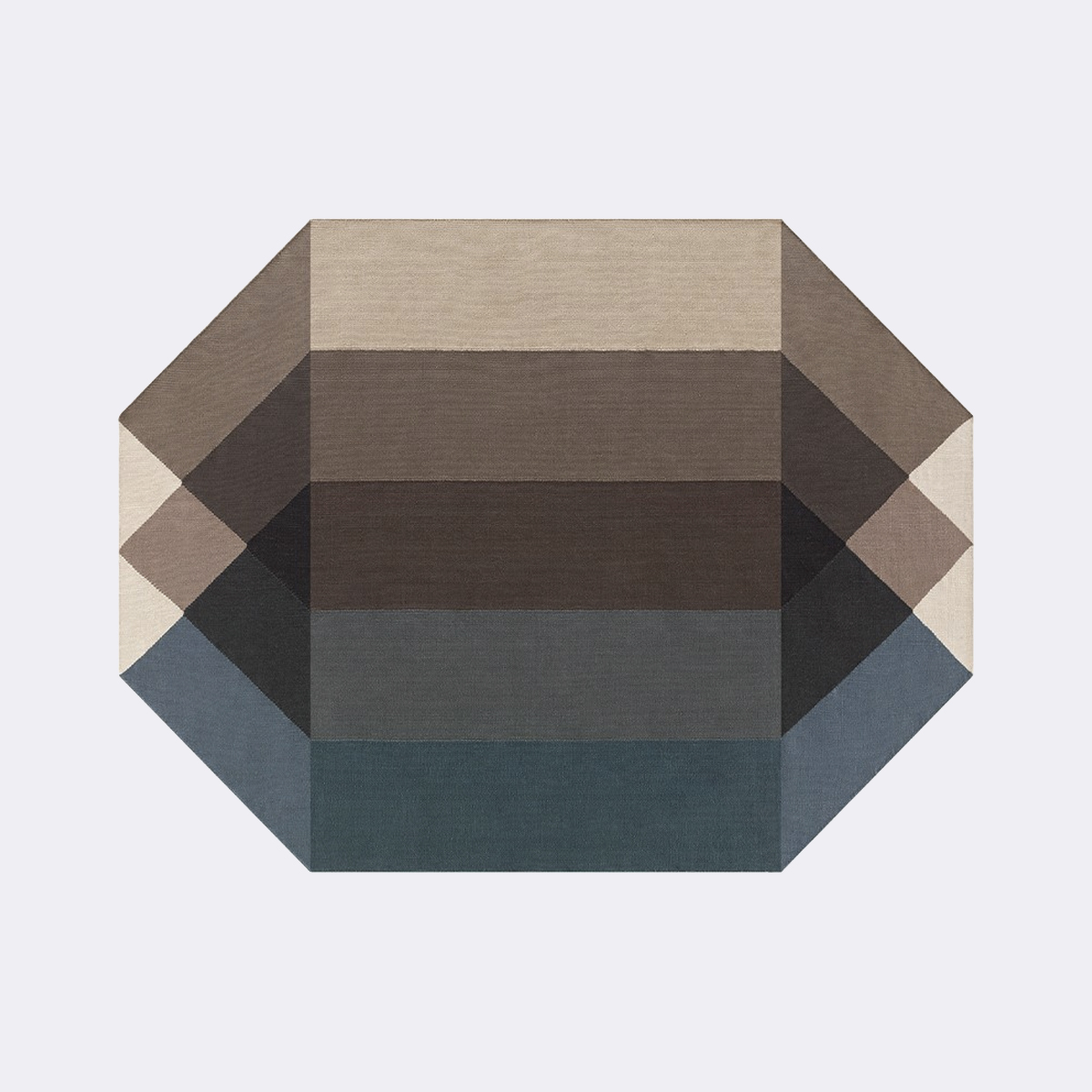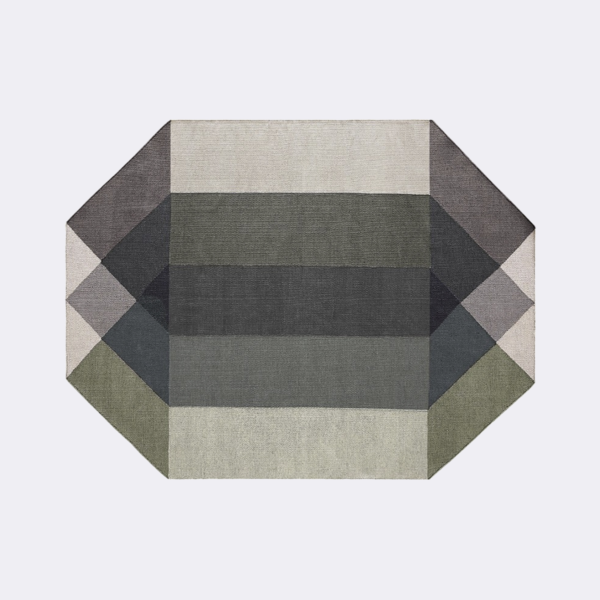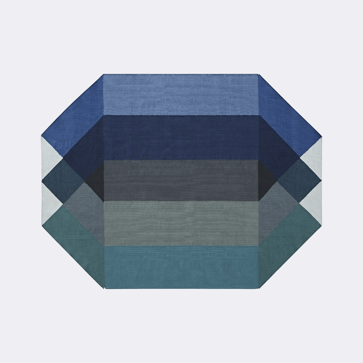 Com um formato octogonal invulgar, o padrão de figuras geométricas é inspirado nas faces facetadas de um diamante, imitando os seus diferentes graus de opacidade e transparência. Os fios PET reciclados podem ser manipulados nos mesmos teares manuais utilizados na produção de outros tapetes kilim, resultando numa peça muito leve e flexível. O kilim Diamond está disponível em três tamanhos, e em cinco tons.