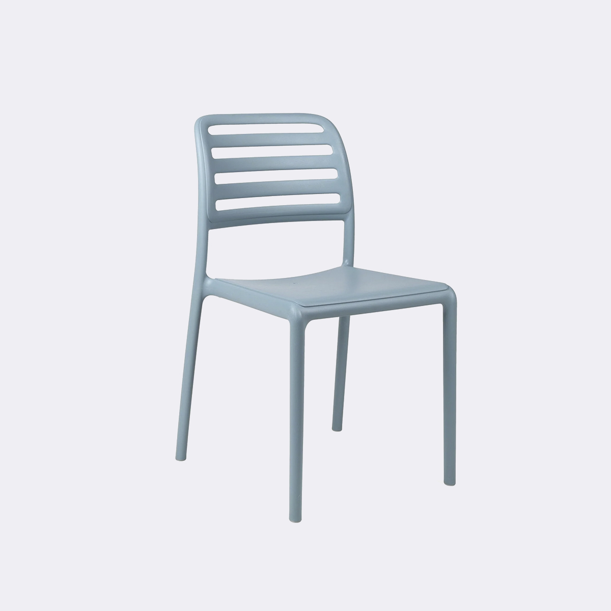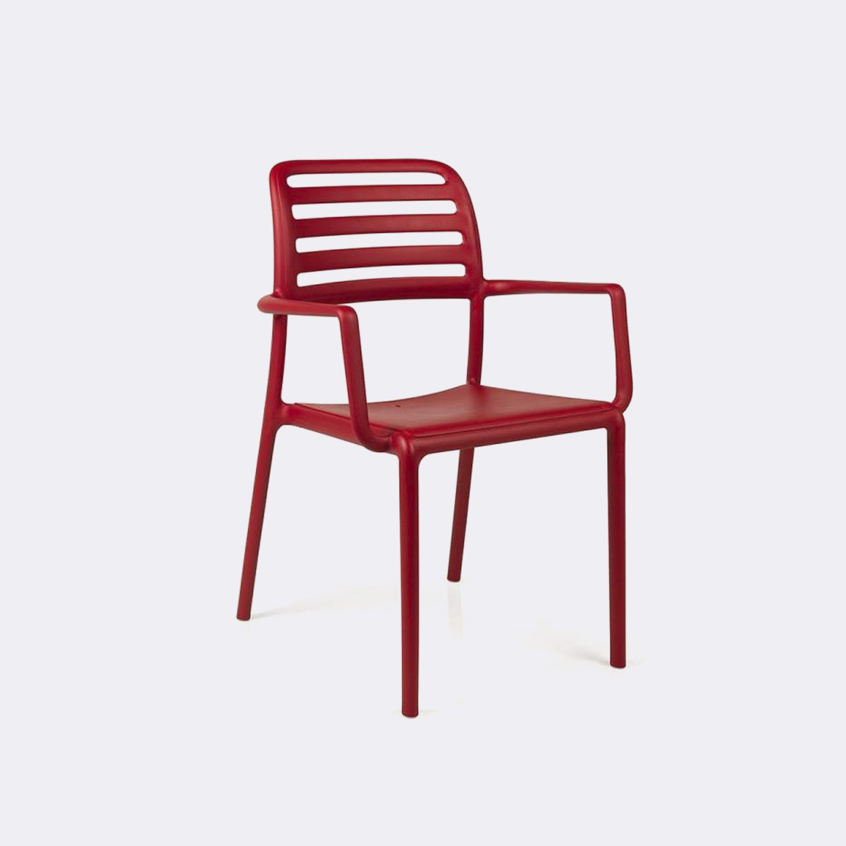 Linhas essenciais para um assento leve, prático e confortável. Costa é uma cadeira de exterior com encosto de ripas em resina de fibra de vidro: uma estrutura tubular sem costuras, com perfil e cantos arredondados.