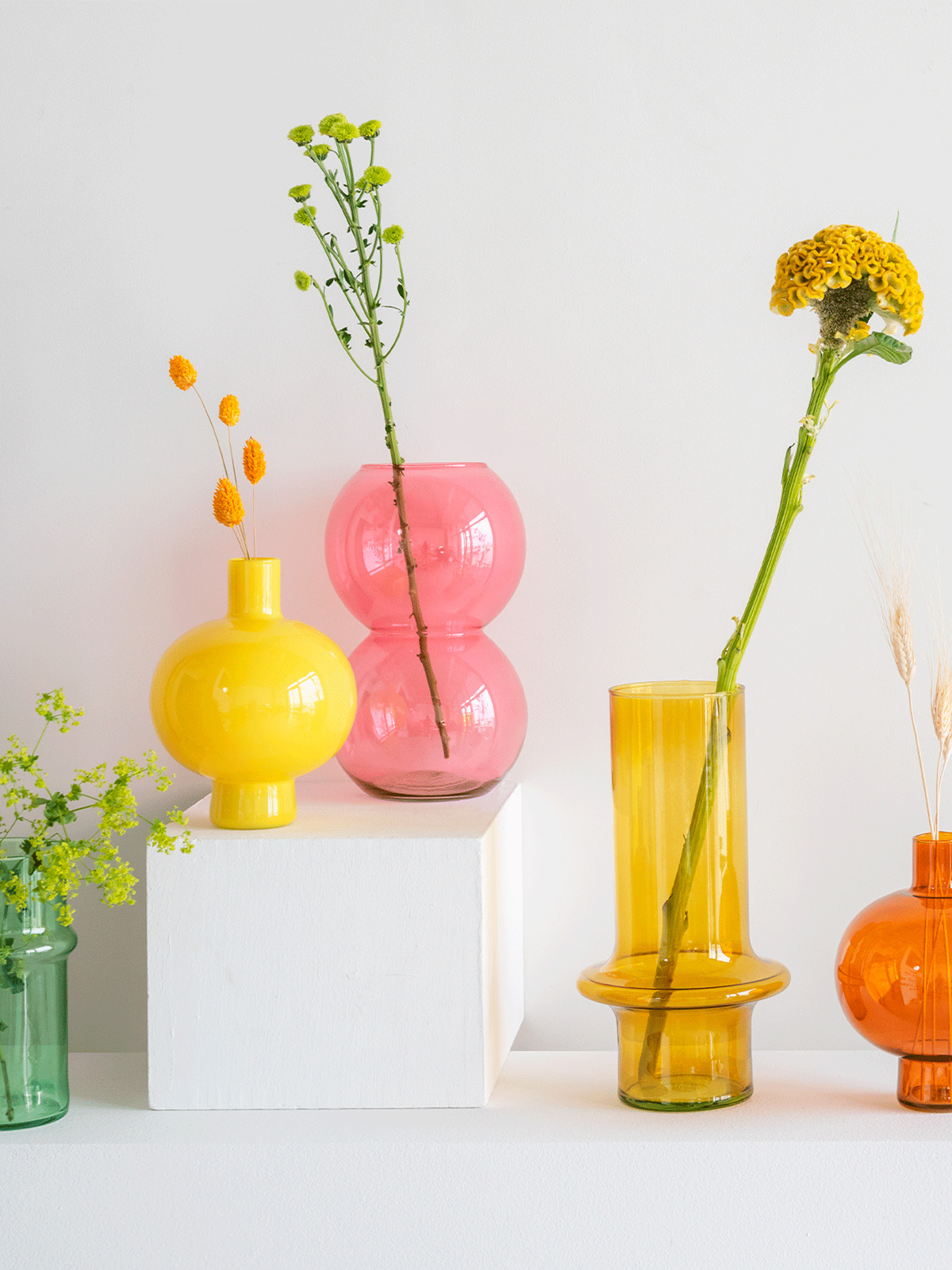 Dois pontos, conectados e empilhados. Perfeitamente redonda, feita em vidro reciclado e boca soprada na Polónia por artesãos habilidosos. Este vaso convida-o a colher algumas flores silvestres ou a ir ao mercado local para comprar um bouquê fresco e adicionar um toque de verão à sua casa.