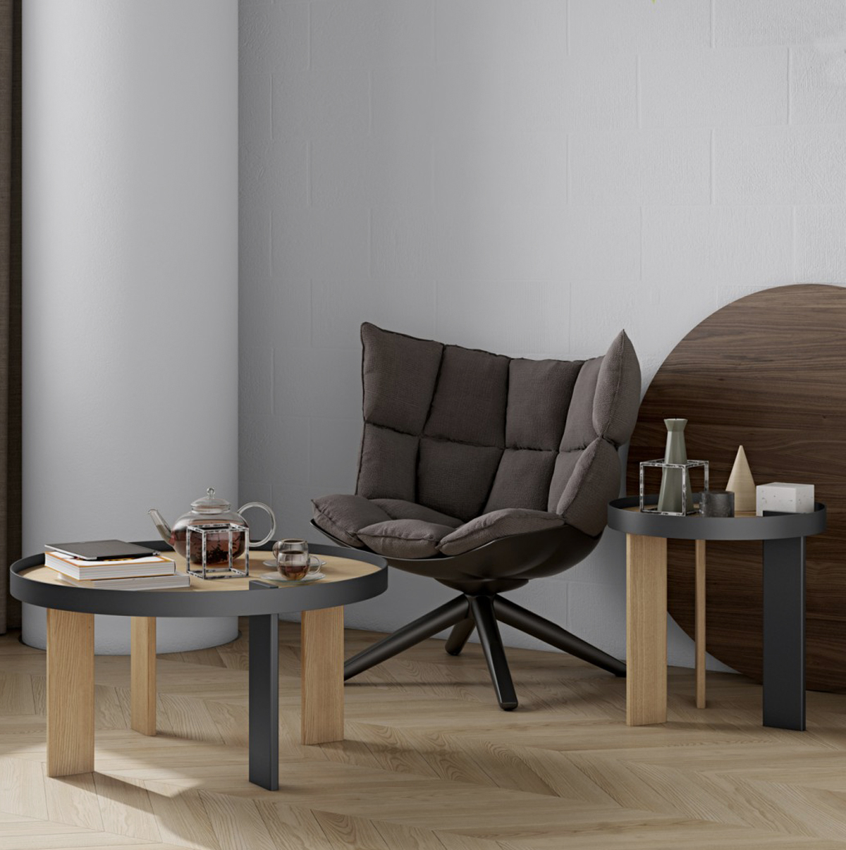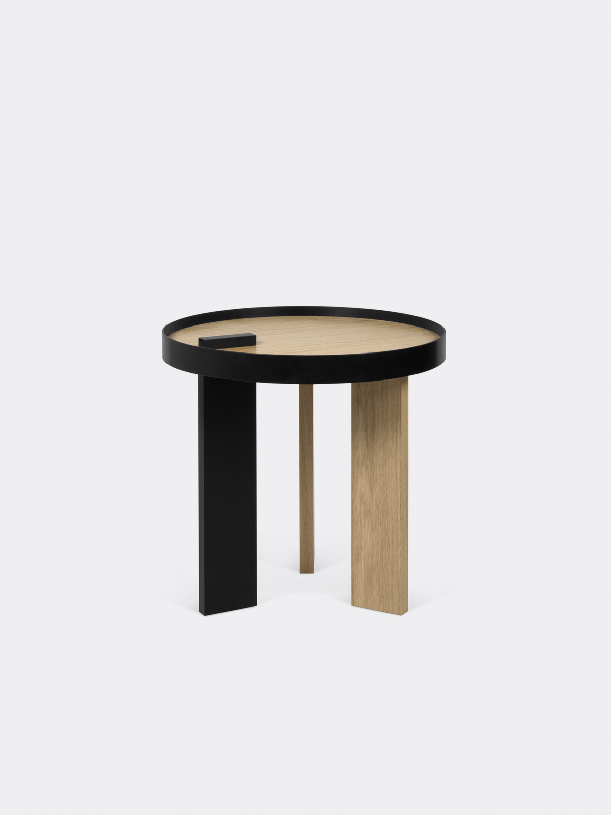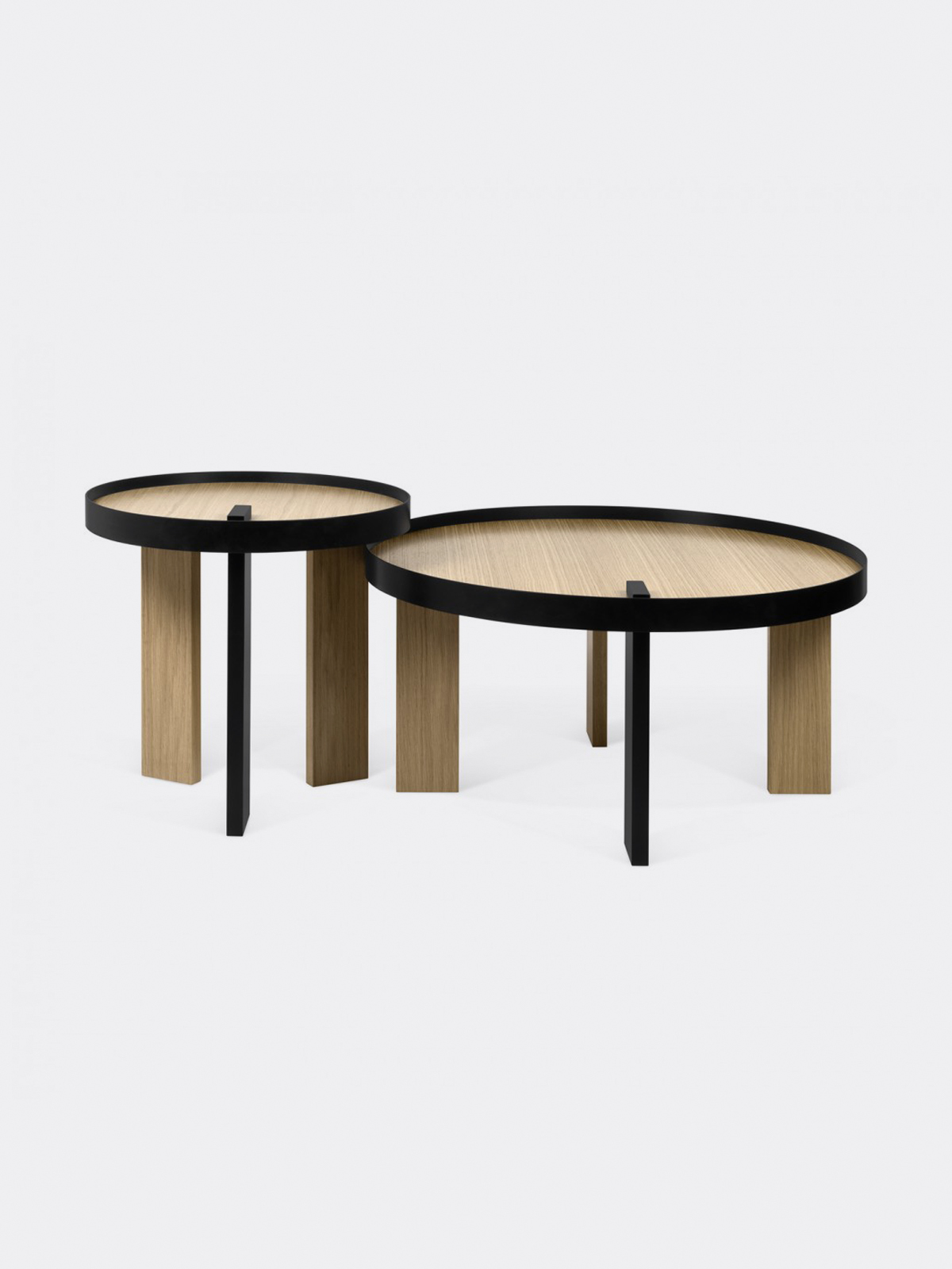 O design das mesas de apoio Bruno baseia-se na ideia jocosa de uma perna com um acabamento diferente continuar através do tampo da mesa, criando a ilusão de atravessá-lo. O contraste entre a perna preta e a estrutura metálica da mesma cor, com o carvalho folheado da restante peça, acentua ainda mais o pretendido jogo visual, tornando esta mesa num objecto que necessita um segundo olhar do observador, para que interiorize esta afirmação mais arrojada do seu design. Quando conjugadas entre si, mesa de apoio e centro, podem ser dispostas segundo diferentes posições, e formas geométrica acabam por surgir, trazendo uma interessante faceta a esta colecção.