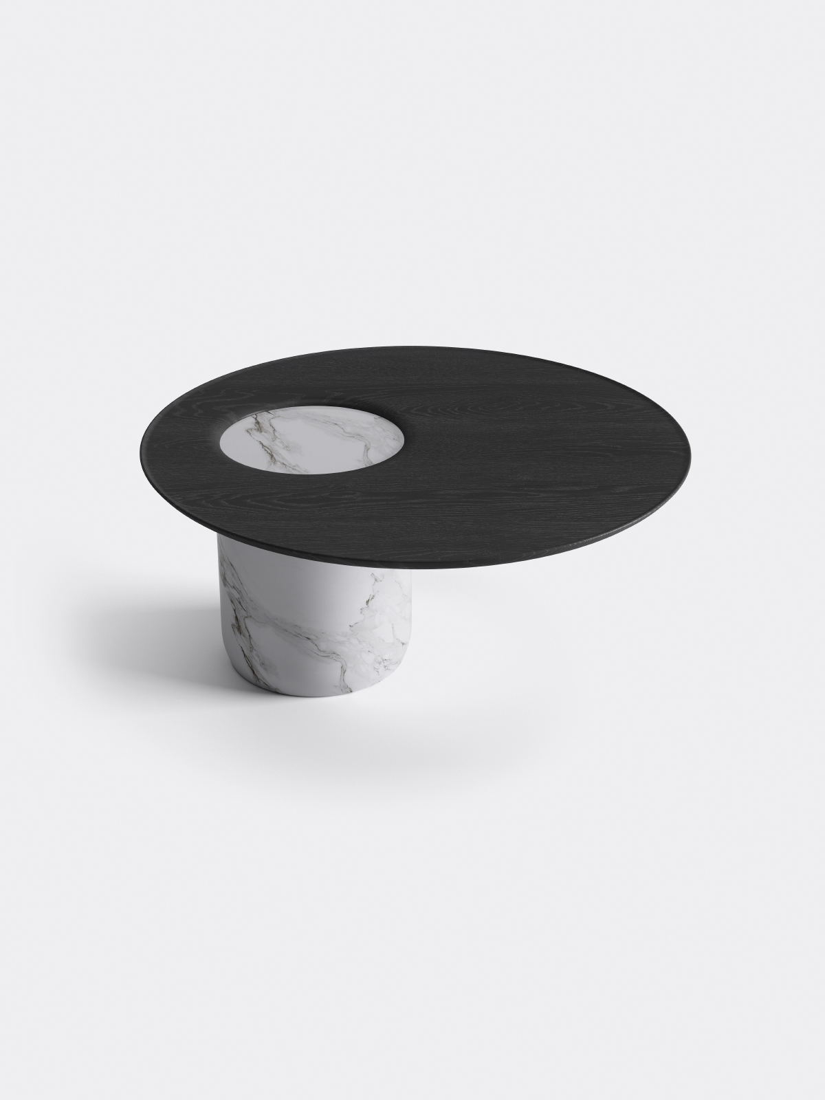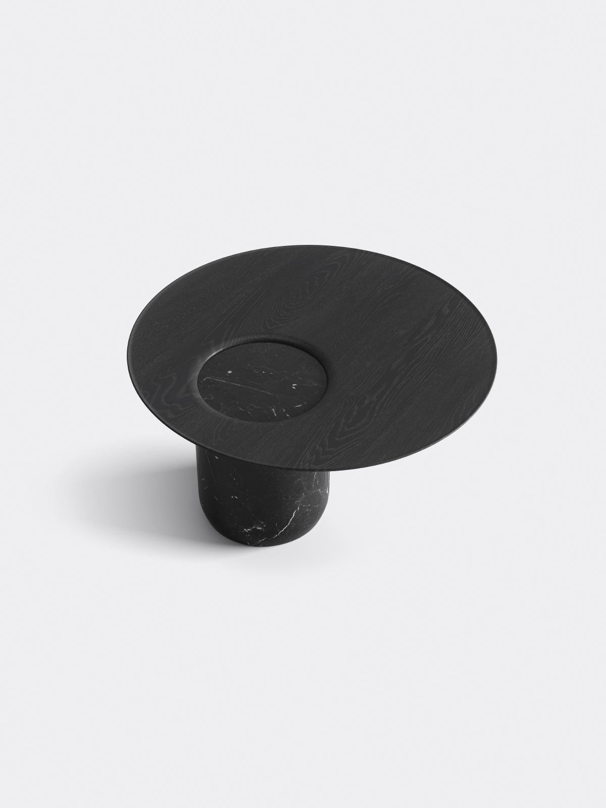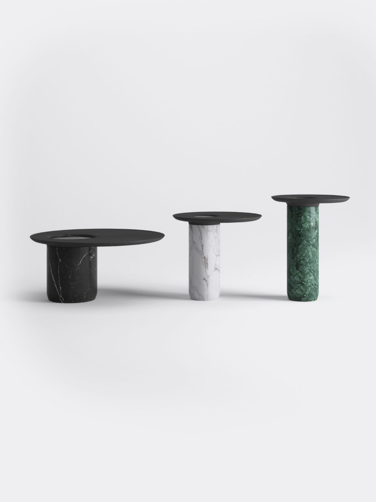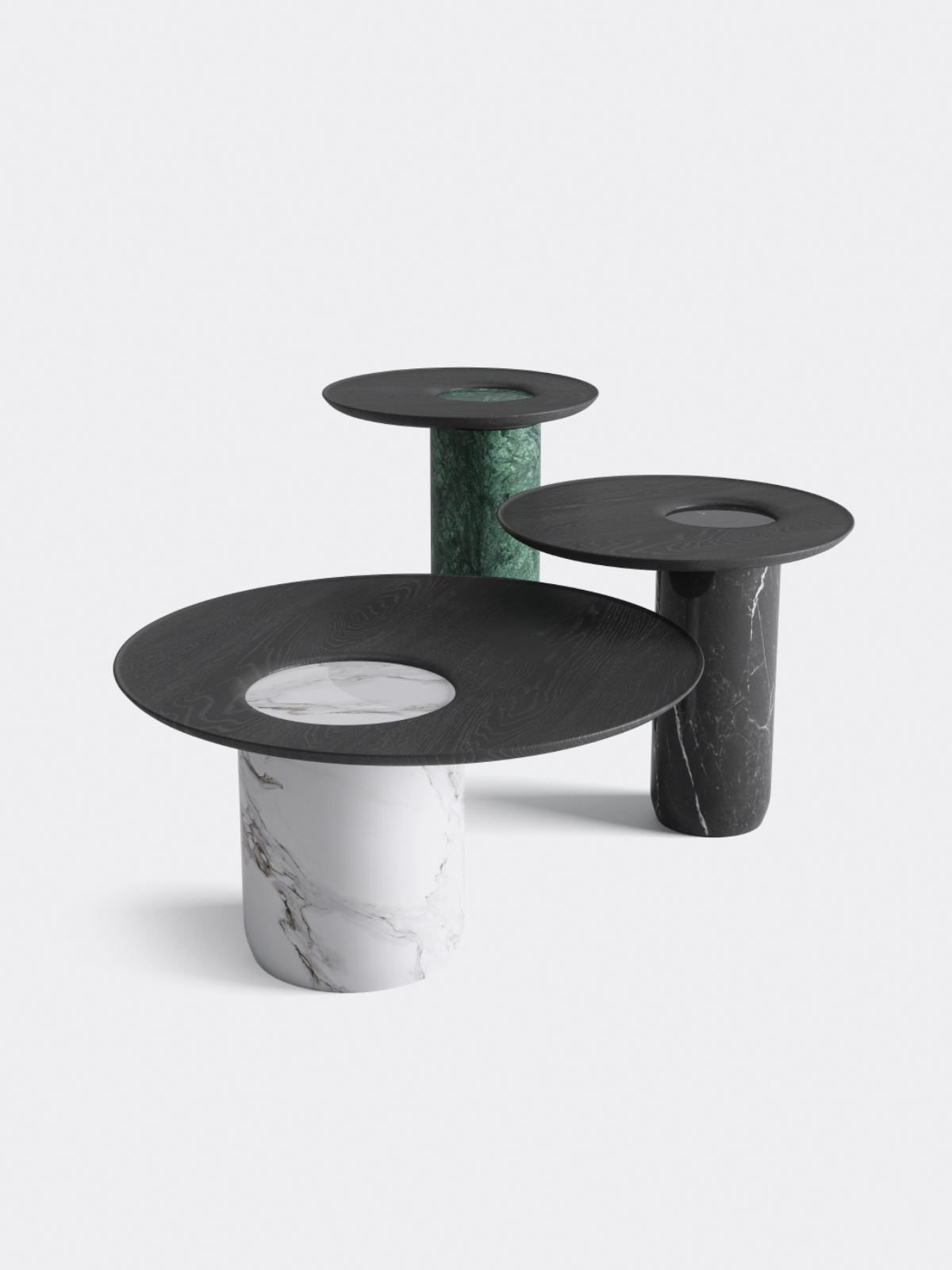 Lago é um conjunto de mesas disponíveis em três tamanhos diferentes, compostas por uma sólida base de mármore e um delicado tampo em madeira, combinando elegância e funcionalidade.