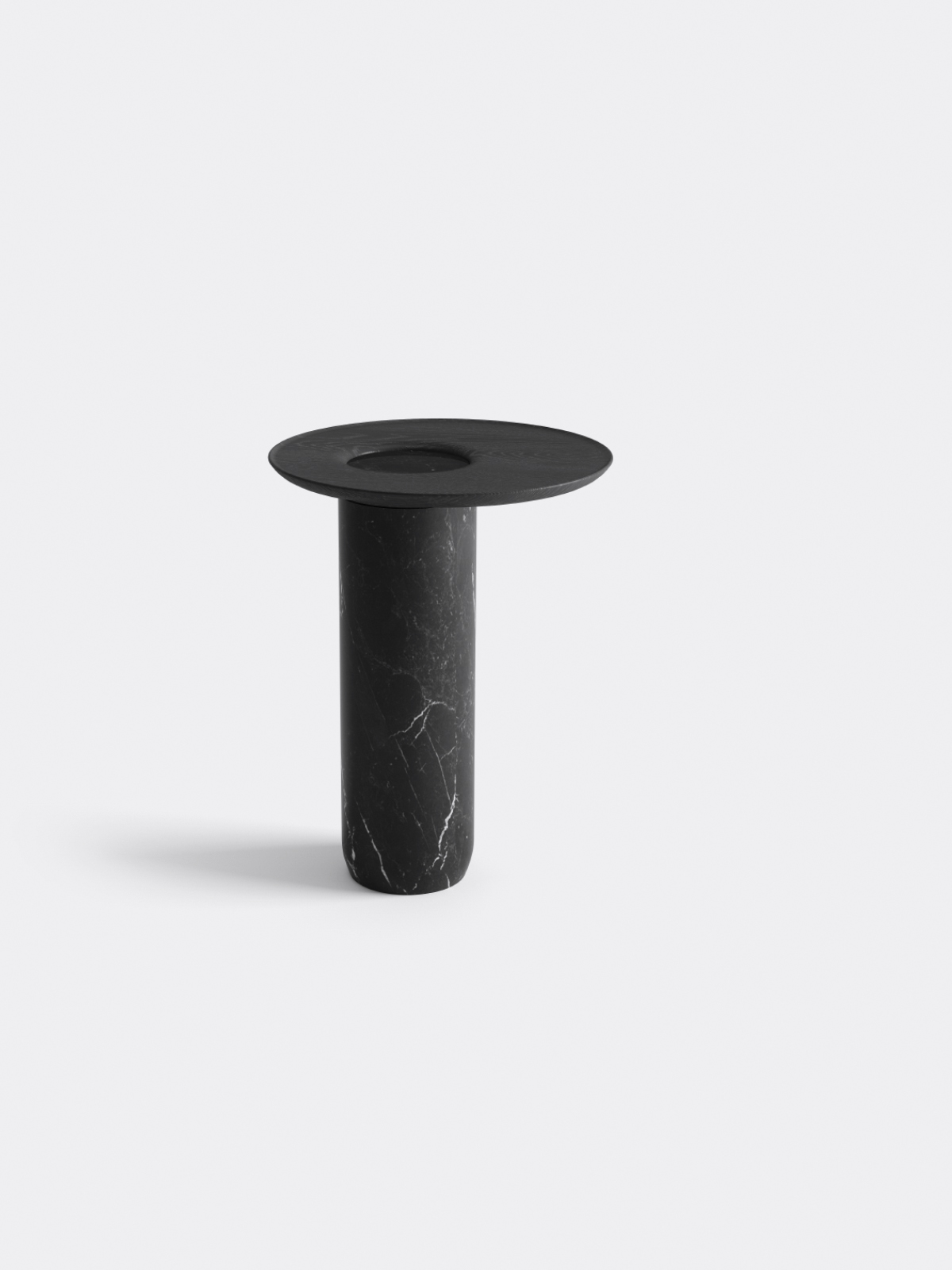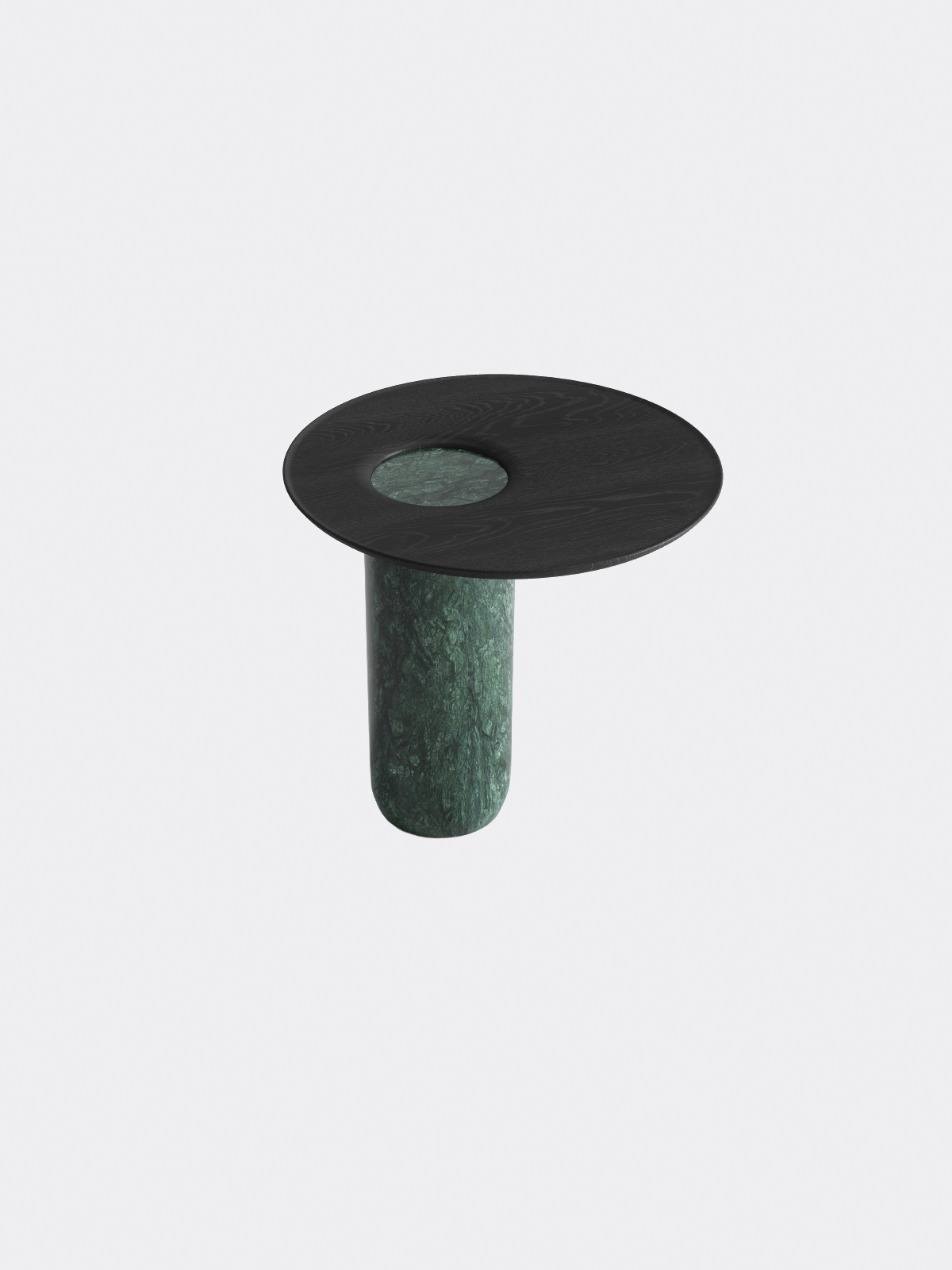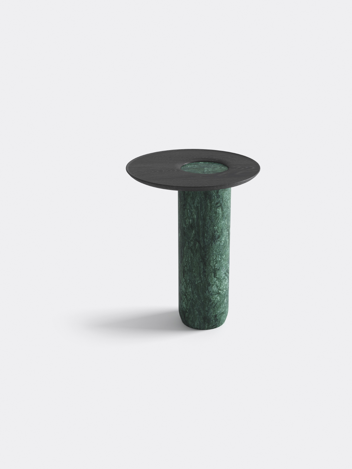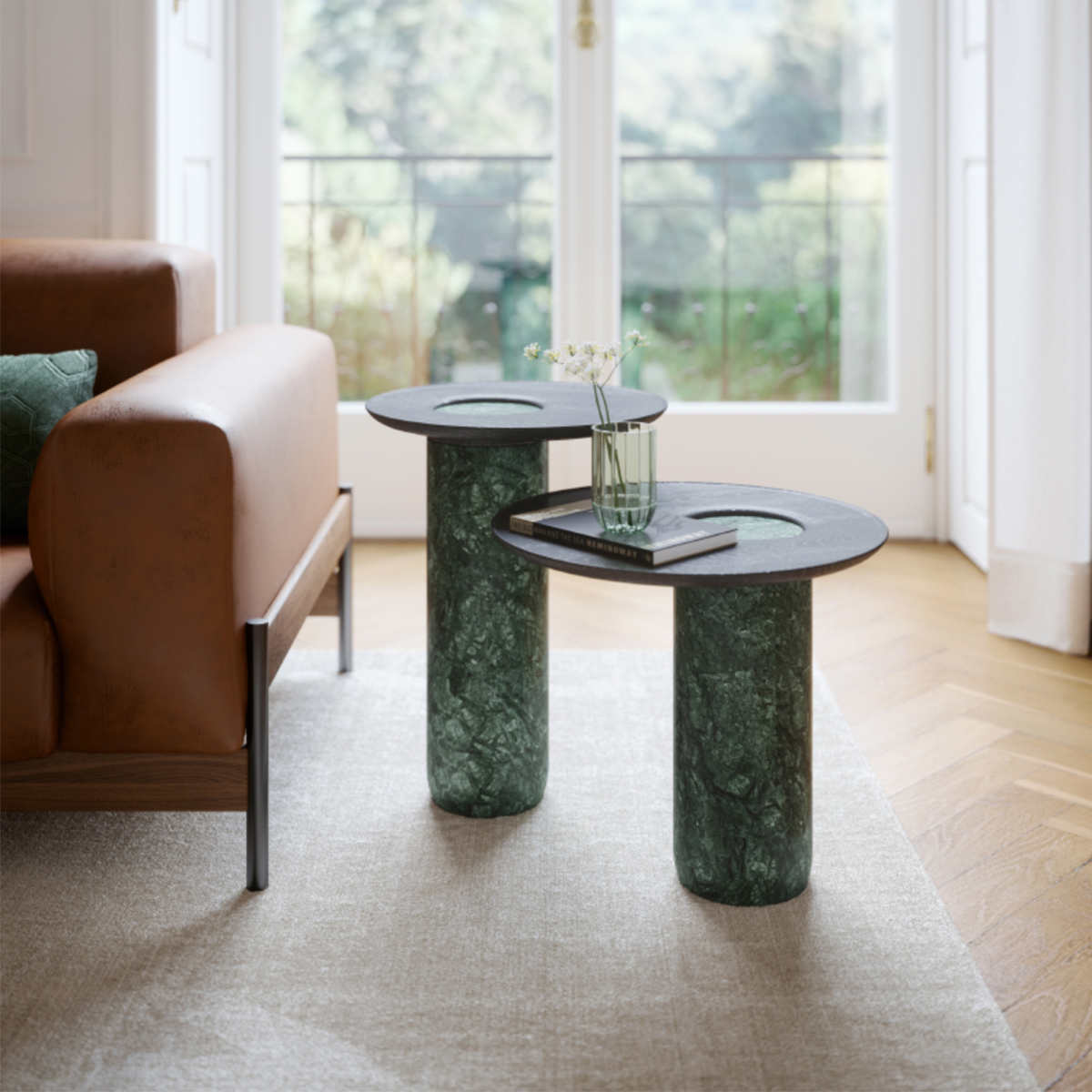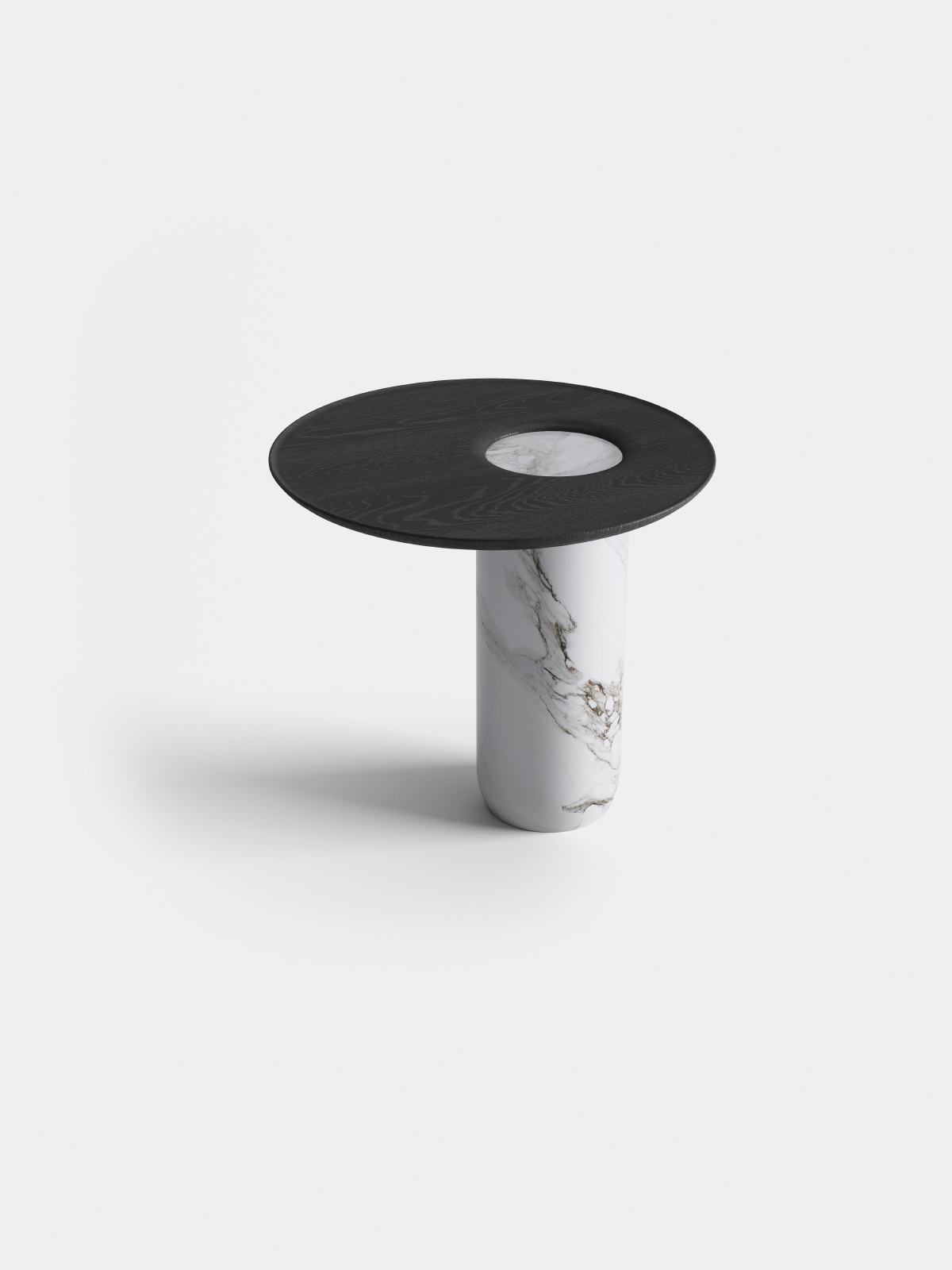 Lago é um conjunto de mesas disponíveis em três tamanhos diferentes, compostas por uma sólida base de mármore e um delicado tampo em madeira, combinando elegância e funcionalidade.
